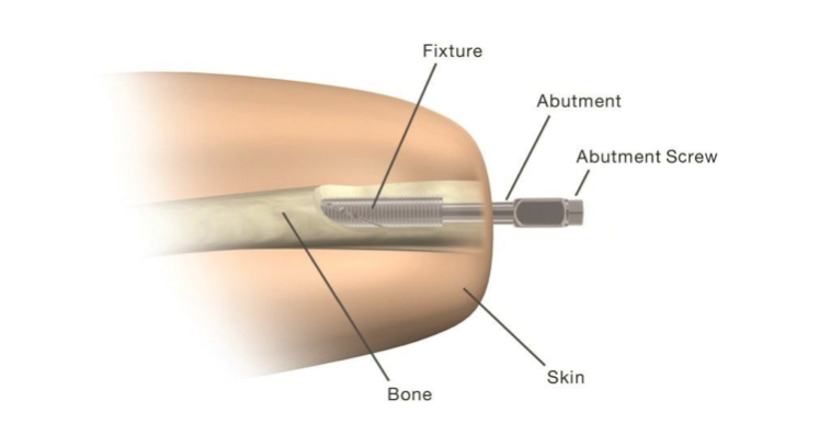 - Abutment: Skin penetrating connection attached to the fixture